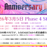 - Anniversary104 NFT 販売会(Phase4)開催のお知らせ2026年3月5日 Anniversary104 NFT 販売会(Phase4) を開催いたします。 … 続きを読む: Anniversary104 NFT 販売会(Phase4)開催のお知らせ