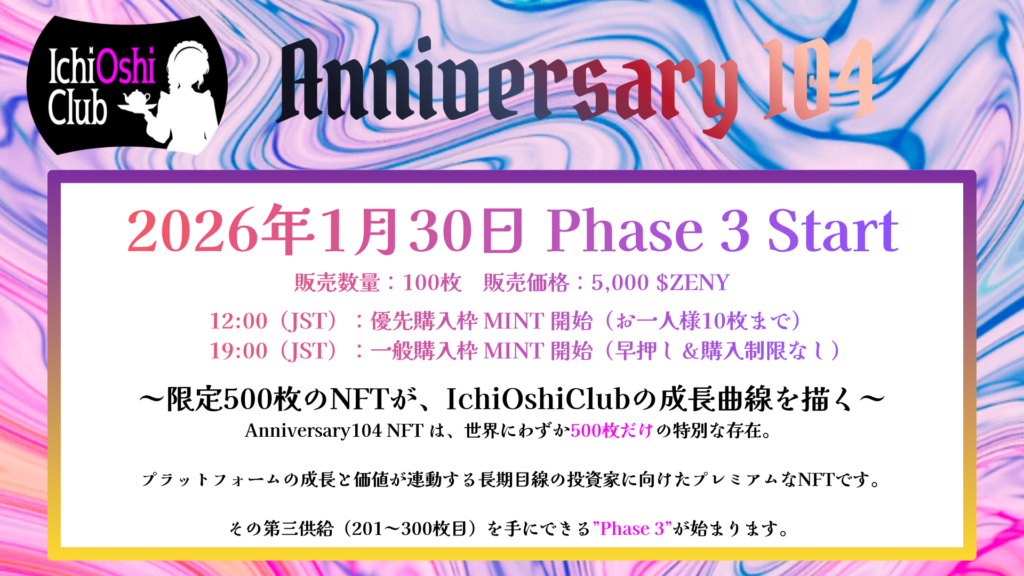 2026年1月30日 Anniversary104 NFT 販売会(Phase3) を開催いたします。